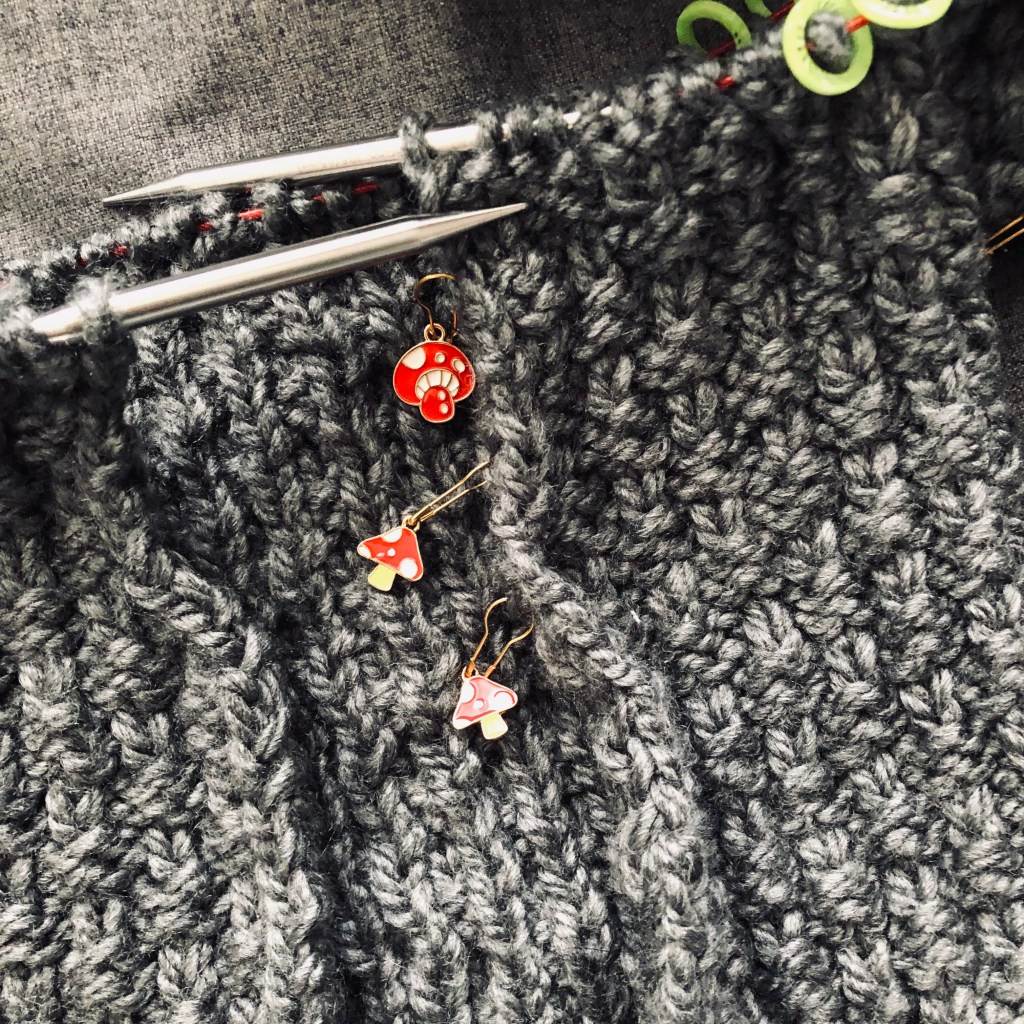 The body has also been working up really quickly. It’s an easy pattern to check in with regularly to make sure it’s looking right. Not too difficult so I can actually pay attention to the show I’m watching while knitting but it not being boring and repetitive like a stockinette knit.