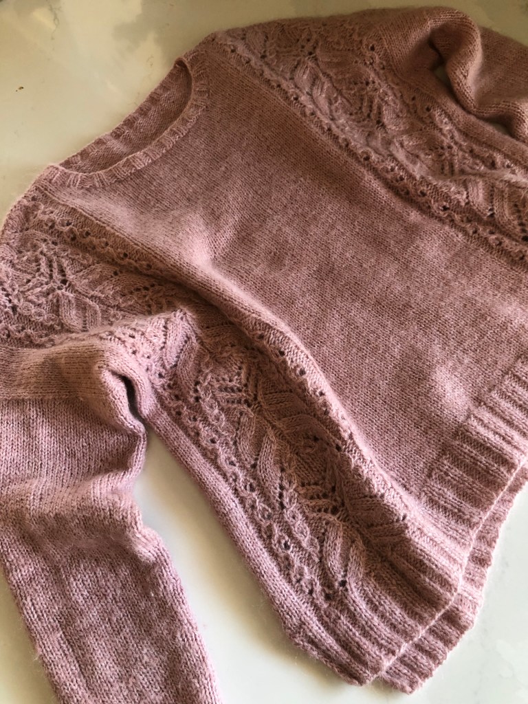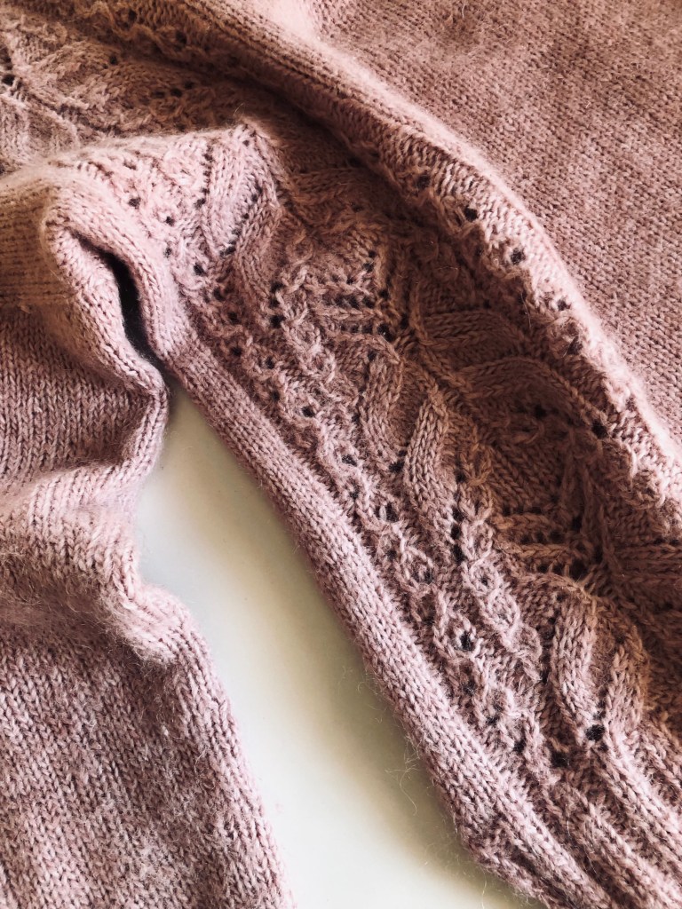 The only alterations I remember making that were different from the pattern was an adjustment on the sleeves. Instead of picking up the recommended stitches for size 2 I picked up the number for size 3 and also made it shorter than recommended. I had knit one arm with the recommended size and length and decided to block it, just to see. Something felt off. I’m so glad I did because it was sooo long for me and very tight which just didn’t make sense or feel right to me. I redid the sleeve and it was perfect.